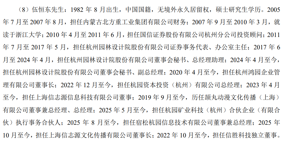 据浙江监管局显示,2025年1月,杭州园林设计院及包括伍恒东在内的高管因信息披露问题被出具了警示函。