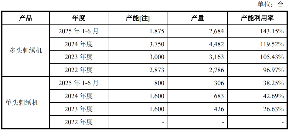 报告期内公司电脑刺绣机主要产品分为多头刺绣机和单头刺绣机,2024年度产能分别为3,750台和1,600台,意味着多头刺绣机要增产60%,而单头年产1,600台能否需要5,000台单头刺绣机机架?2024年,公司单头刺绣机产能利用率为42.69%,即产量仅生产了683台,2025年为306台,还未到一半。