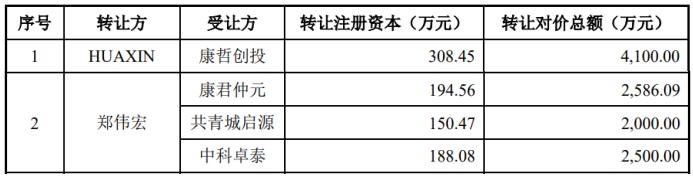 2022年4月,HUAXIN LIAO以5,920万元价格向中银投资转让877.99万元的注册资本。