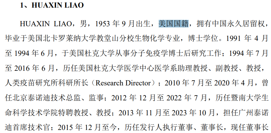 根据HUAXIN LIAO履历显示,其现年73岁拥有美国国籍,早年一直在美国杜克大学从事研究和教学工作,57岁即将退休的年龄回到国内创业教学,主抓发行人的技术工作。