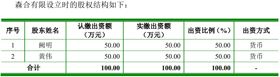发行人前身广西南宁森合化工有限公司(后更名为广西南宁森合化工有限公司,简称“森合有限”)设立于2011年4月,由阙明和黄伟各出资50万元设立。