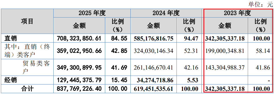 上会稿显示,公司产品销售以直销模式为主、经销模式为辅,报告期内经销收入分别为0、3,427.47万元和12,944.54万元,占比分别为0、5.53%和15.45%。