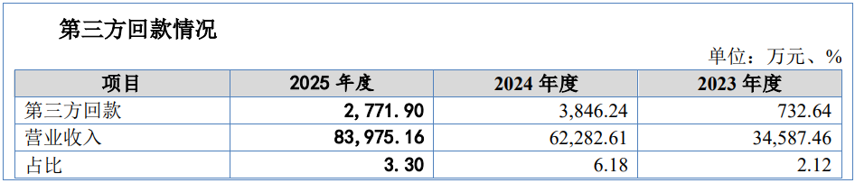 回款方面,公司存在客户的关联方或指定主体代为付款。报告期内,公司第三方回款金额分别为732.64万元、3,846.24万元和2,771.90万元,占营业收入比例分别为2.12% 、6.18%和3.30%。