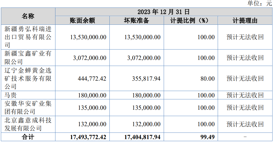 同时,发行人还踩雷了宝鑫矿业、勇弘科瑞进出口贸易、广西伊万特矿业科技、辽宁金蝉黄金选矿、马贵(自然人客户)、安徽矿业等。2025年,前三家企业累计2,233.03万元被计提坏账准备,预计无法收回。