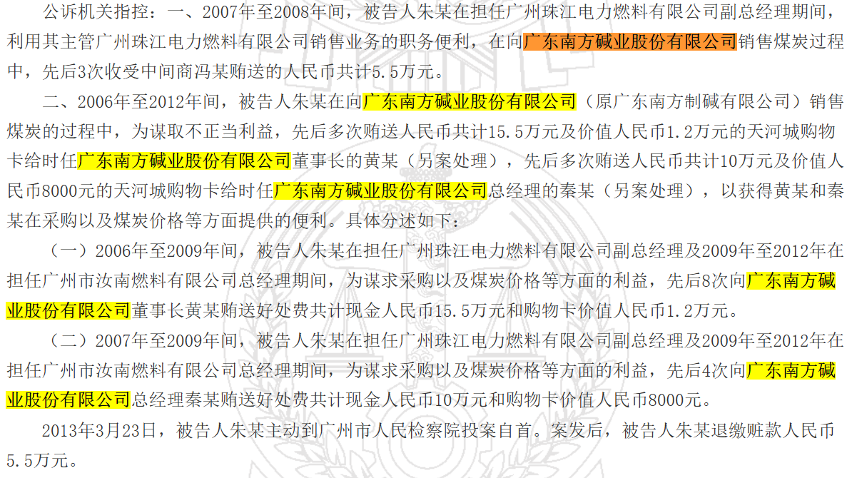 公开资料显示,原湖北双环科技党委书记、董事长吴党生因受贿被判,吴党生在担任主要领导期间,利用职务便利收受他人财物共计351万元及价值63万元住房一套。同样,裁判文书网显示,大供应商广东南方碱业曾出现了原董事长受贿事件。