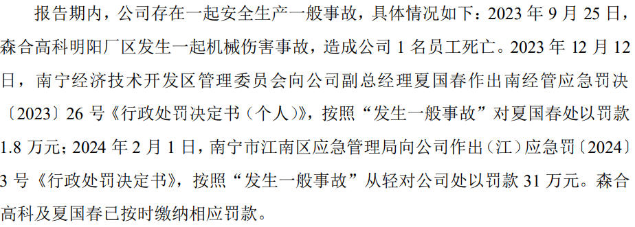 报告期的2023年9月出现了一起员工死亡生产事故,发行人及负责生产方面的副总经理均受到了处罚。