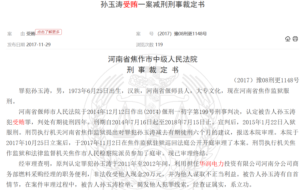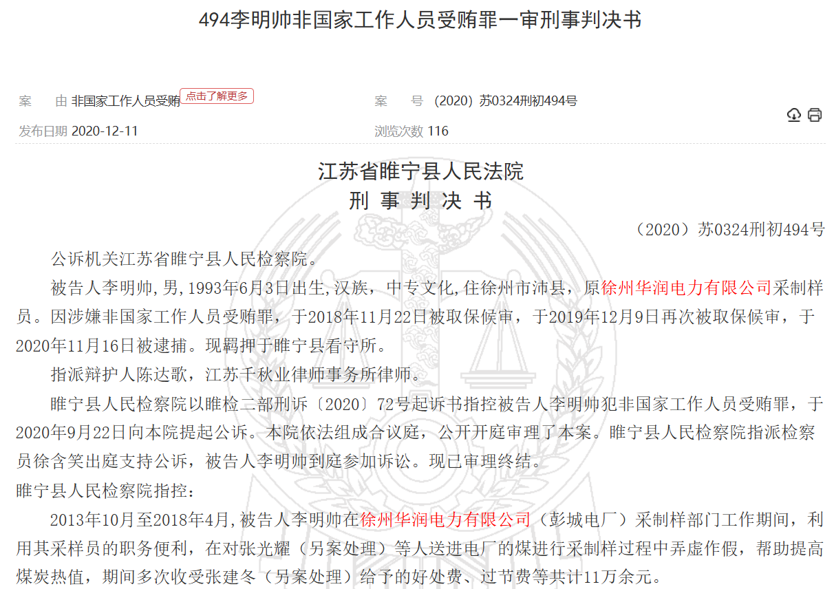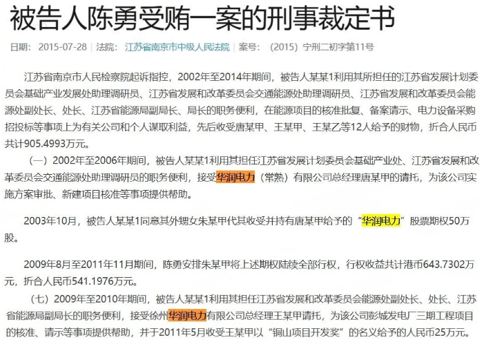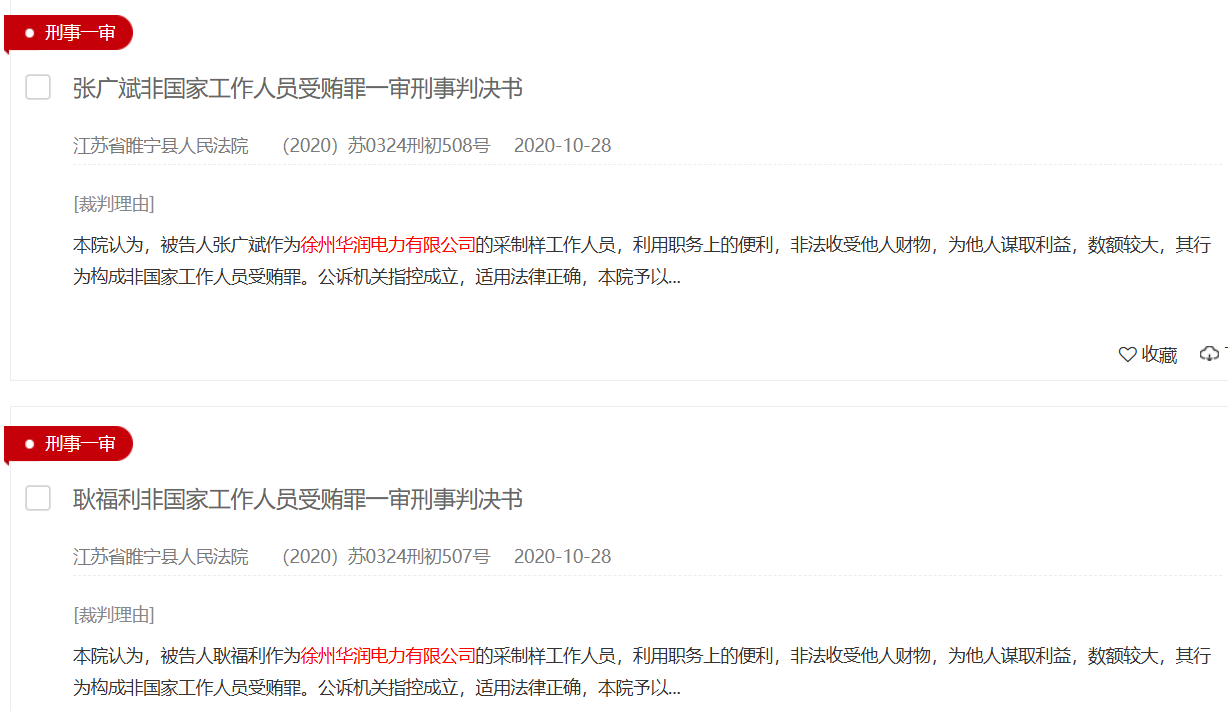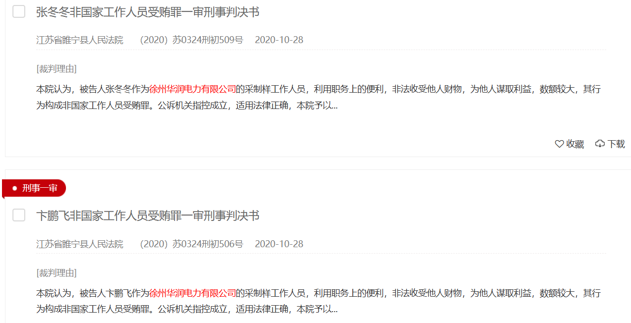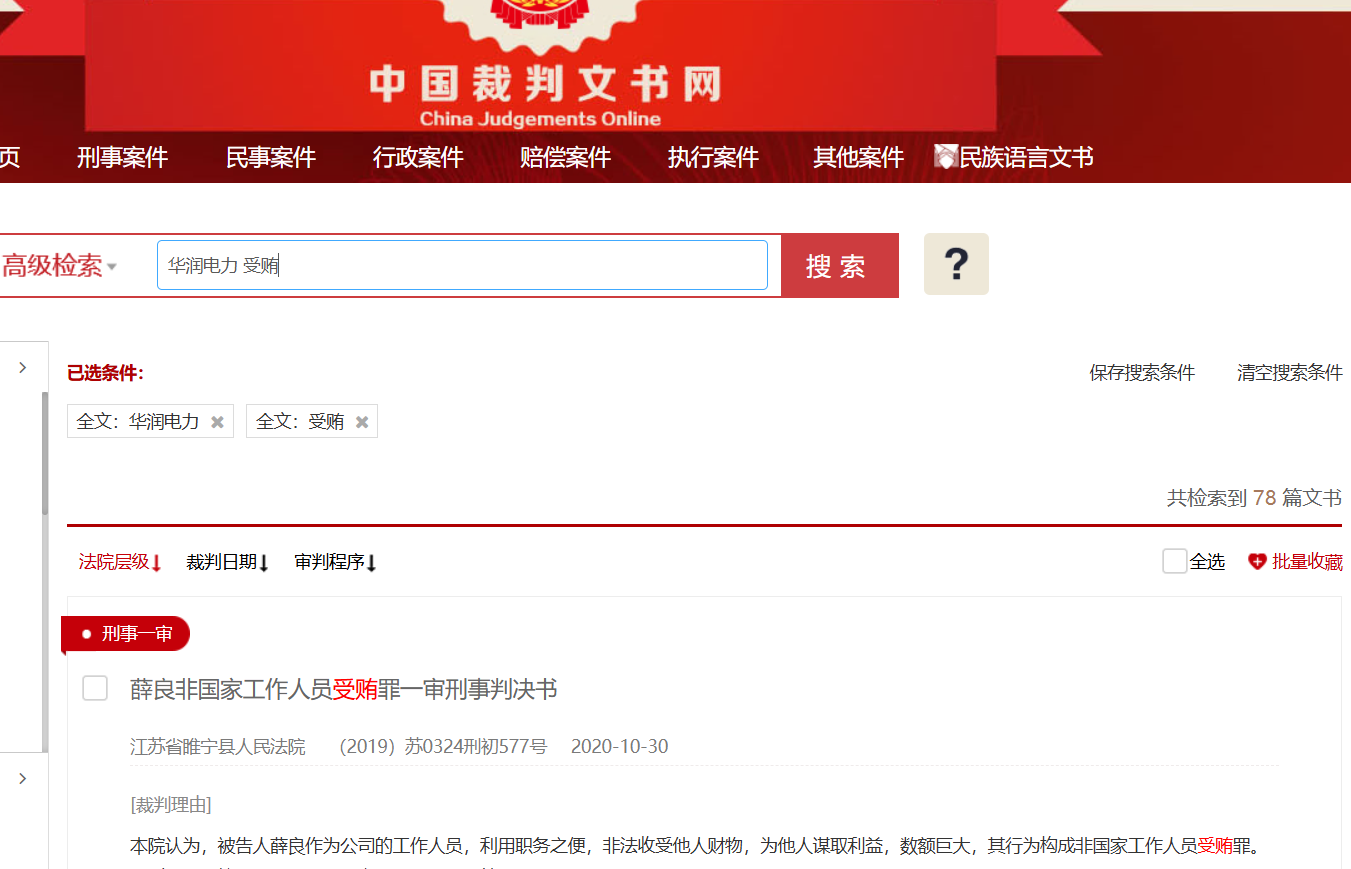 裁判文书网显示,涉及华润电力的受贿案件文书达70多篇,华润电力受贿案件中还包括曾出现了一起窝案,2020年10月,江苏徐州市睢宁县法院对一起销售伪劣产品和对非国家工作人员行贿案作出终审判决,涉及徐州华润电力有限公司采制样、调度、程控等多个岗位30余人的受贿窝案。