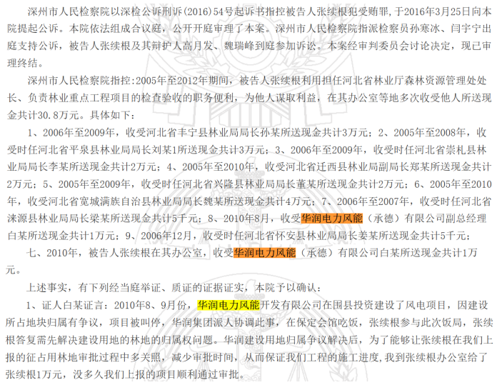 据深州市人民法院发布的案号为(2016)冀1182刑初66号的《张续根受贿一审刑事判决书》显示,2010年8月,华润电力风能承德公司总经理白某为审批建设用地向时任河北省林业厅森林资源管理处处长张续根贿送现金1万元。