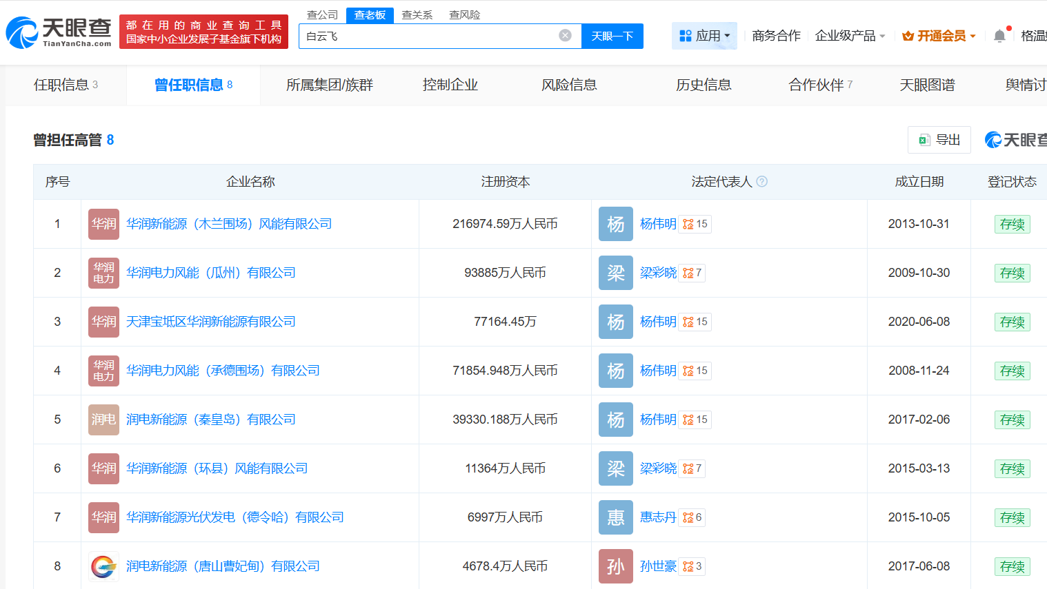 天眼查显示,上述案件中的白某或为白云飞,曾在华润电力风能多家下属企业担任过高管。