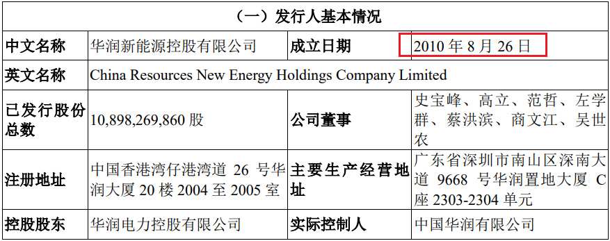 2010年8月26日,发行人于中国香港注册成立,设立时唯一股东为华润电力。华润电力于2003年11月在香港联交所完成首次公开发行并上市,股份代号为0836.HK。