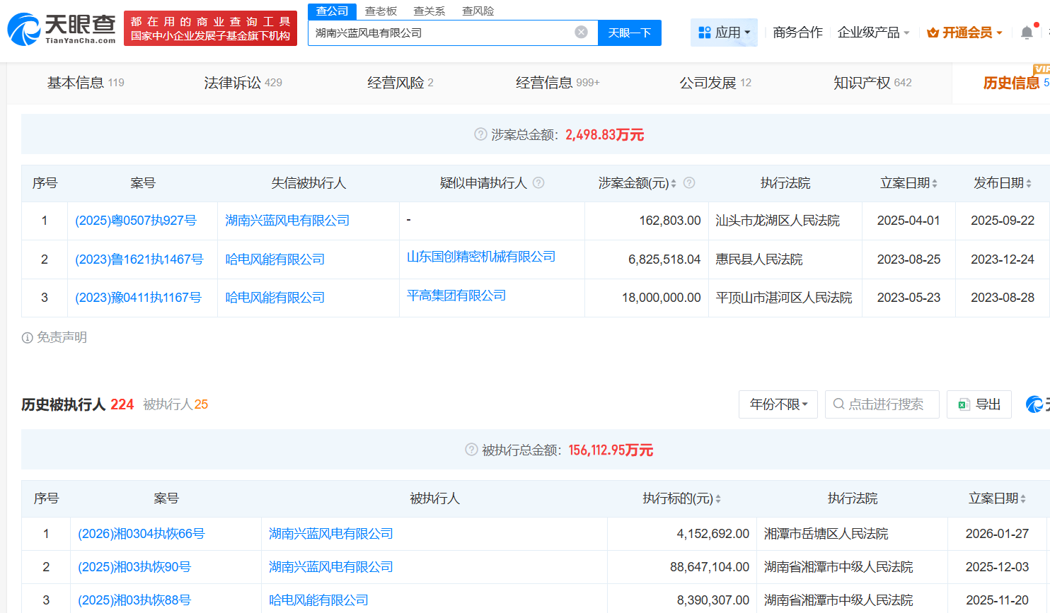 天眼查显示,湖南兴蓝风电存在较大风险,列入被执行人200多次涉案总额15.6亿元,被限消共81次涉案总额约9.58亿元,失信3次涉案金额0.25亿元。