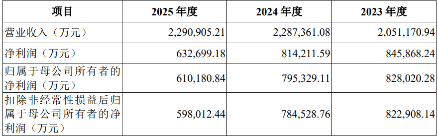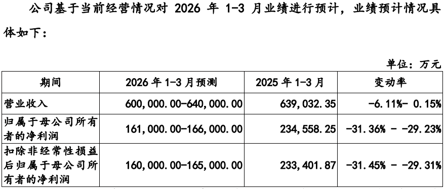 更需警惕的是,最新业绩出现了收入和利润的双下滑。2026年1-3月,公司预计实现营业收入600,000.00万元至640,000.00万元,同比变化-6.11%至0.15%;公司预计实现归属于母公司所有者的净利润161,000.00万元至166,000.00万元,同比下降29.23%至31.36%,预计实现扣除非经常性损益后归属于母公司所有者的净利润160,000.00 万元至 165,000.00万元,同比下降29.31%至31.45%。
