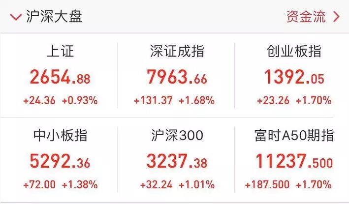 A股三大股指低开后强势上行,截至收盘,三大股指全线飘红,而且涨幅都不小:沪指收涨0.93%,报2654.88点;深成指收涨1.68%,报7963.66点;创业板指收涨1.70%,报1392.05点。