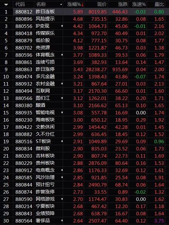 板块方面,低价股、体育概念、传媒娱乐、互联网、酿酒板块涨幅居前。
