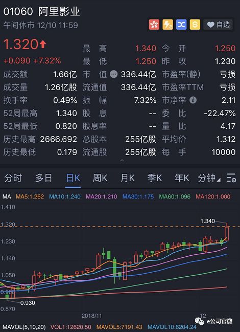 根据协议,阿里影业将以每股1.25港元向阿里巴巴集团发行10亿股新股,通过这次股票发行筹集总额达12.5亿港元。 交易完成后,阿里巴巴集团将对阿里影业实现实质控制,并在阿里影业董事会拥有大多数席位。早盘股价造好,阿里影业一度涨近9%,最高报1.34港元,创今年新高,截至午间收盘涨7.32%,最新市值336.44亿港元,较前一个交易日增长了逾20亿港元。