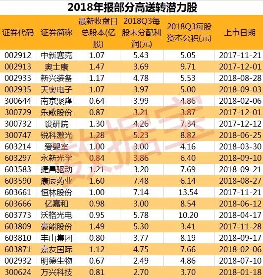 从发布预案12股的特征筛选, 2017年以后上市,总股本小于2亿,每股未分配利润大于2.38元,每股资本公积超过3.37元。统计发现,32股符合上述条件,包括爱婴室、奥士康、康宸药业、明德生物等。