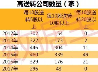从高送转公司来看,最新披露分红送转预案12股,每10股最大送转仅9.5股。而2017年每10股送转10股以上的有43家公司;2016年这一公司数量达到176家,而每10股送转20股以上的有21家。