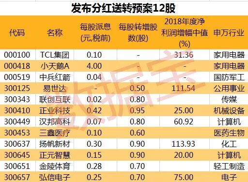 截至最新收盘日,共有12股发布2018年度分红及高送转预案。其中TCL集团、小天鹅A、中兵红箭3股仅分红;易世达每10股转增5股;其余8家将分红并转增股本。