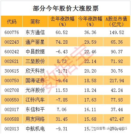 统计显示,剔除部分次新股后,去年跌幅不足10%或者是逆市上涨的股票,只有11只股票今年以来大涨超15%。其中,5G概念龙头股东方通信去年大涨超60%,今年再接再厉大涨36.36%。创投概念龙头通产丽星位居今年涨幅榜第二位,达到29.59%,该股去年涨幅超过74%。涨幅榜第三位是中昌数据,今年大涨22.46%,去年小幅下跌6.43%。