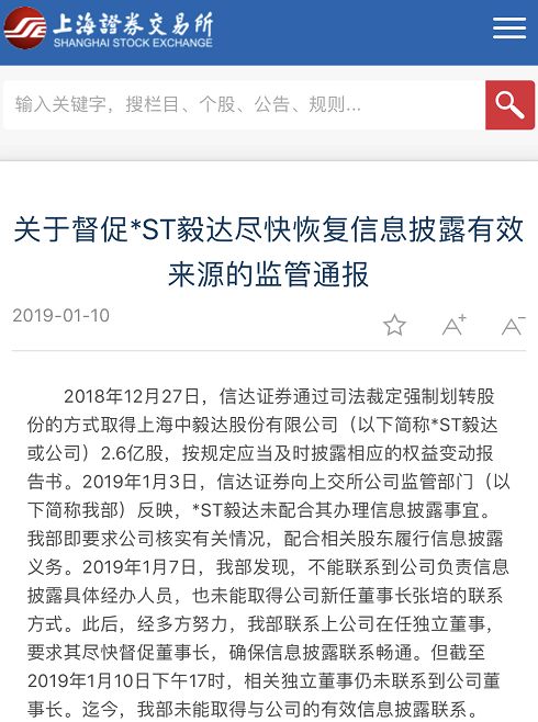 2018年12月27日,信达证券通过司法裁定强制划转股份的方式取得*ST毅达2.6亿股,按照规定,应当及时披露相应的权益变动报告书,上交所昨日晚间发布的《关于督促*ST毅达尽快恢复信息披露有效来源的监管通报》(简称《通报》)显示,*ST毅达既没有配合信达证券办理信息披露事宜,上交所还不能联系到公司负责信息披露具体经办人员,也未能取得公司新任董事长张培的联系方式。