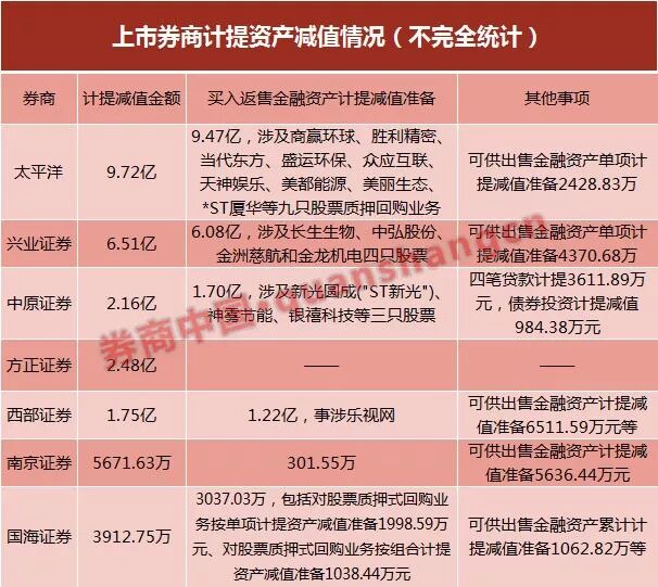 兴业证券计提6.51亿元,减少净利润4.88亿元,长生生物、中弘股份等4笔股票质押,相当于2017年归母净利润的21%;中原证券计提2.16亿元,减少净利润1.62亿元,涉及ST新光、神雾节能等3笔股票质,相当于2017年归母净利润的36.65%;方正证券计提2.48亿元,减少净利润1.86亿元,2018年计提资产减值一项,相当于2017年归母净利润的12.80%。