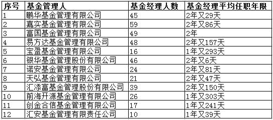 业绩靠前12家基金公司基金经理人数及本公司从业年限 数据来源:同花顺iFinD