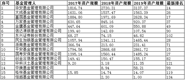 16家基金公司近三年资产管理规模 (单位:亿元) 数据来源:同花顺iFinD