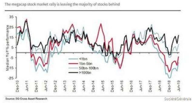 法国兴业银行(SociétéGénérale)定量研究主管安德鲁•拉索恩(Andrew Lapthorne)在最近的一份研究报告中指出,在摩根士丹利资本国际全球指数(MSCI)的近1700名成分股中,超市集团(市值超过1000亿美元)正在向前发展,而那些在低于50亿美元的市值范围仍在努力弥补去年的损失。