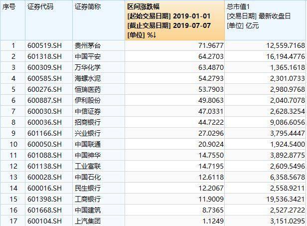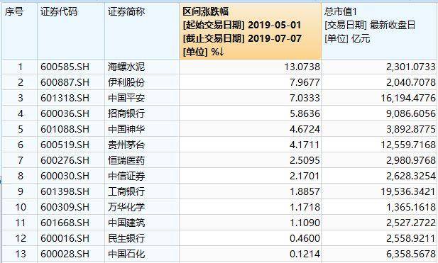 不过,也不能说中国的核心资产就是抽烟、唱酒、吃火锅。如果统计一下数据就会发现,在贸易争端恶化的近两个月中,A股涨幅最大的个股并不是贵州茅台,而是海螺水泥(42.420, -0.88, -2.03%)。涨幅排在贵州茅台前面的还有伊利股份(33.090, -0.38, -1.14%)、中国平安(88.660, -2.19,-2.41%)、招商银行(35.780, -0.69, -1.89%)和中国神华(19.040, -0.69,-3.50%)。不过,这段时间下跌的个股约有三分之二,也就是说的确是这些大股票支撑着股市。
