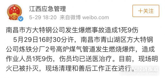 据南昌市应急管理局官方微博消息,5月29日下午4时30分许,南昌市青山湖区方大特钢公司焦化分厂2号高炉在维修中发生气体泄漏,产生燃烧爆炸,造成作业人员1死9伤,伤员均已送医治疗。目前,现场明火已被扑灭,现场清理和善后工作正在进行。