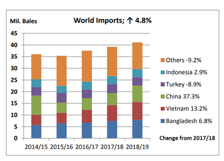 2018年,中国的棉花产量会下降1.82%,而进口总量会增加37.3%。