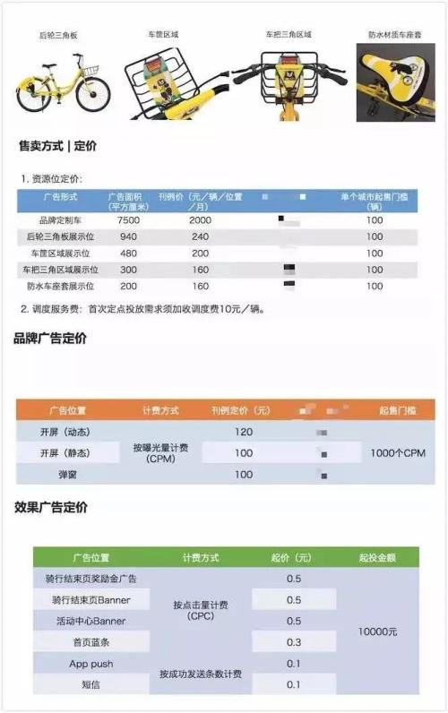 今年5月下旬,由于难以靠用户的单次骑行获取利润,ofo开始发动员工售卖车身广告,以期从B端寻找到大规模变现的路径。根据刊例显示,ofo给出的资源数据为“1500万辆单车、覆盖2.5亿用户”,而品牌定制车身的广告价格为每辆2000元/月,开屏广告价格为100~120元,1000CPM起售。“APP开屏都是些没听过的公司,你就看出ofo多缺钱了。”接近ofo的人士评价。