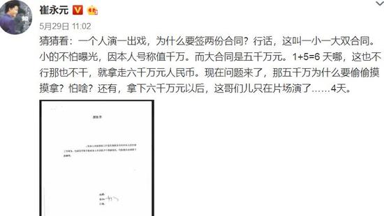 崔永元:一千万那个合同是她的,她说(我另一条微博里说的)阴阳合同不是她的,我也没说是她的,你再看看我怎么写的,对不对。