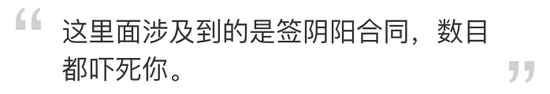 他说,还有一份“阴阳合同”,是关于一对演员夫妇的,两个人涉及的金额达到了7.5个亿……