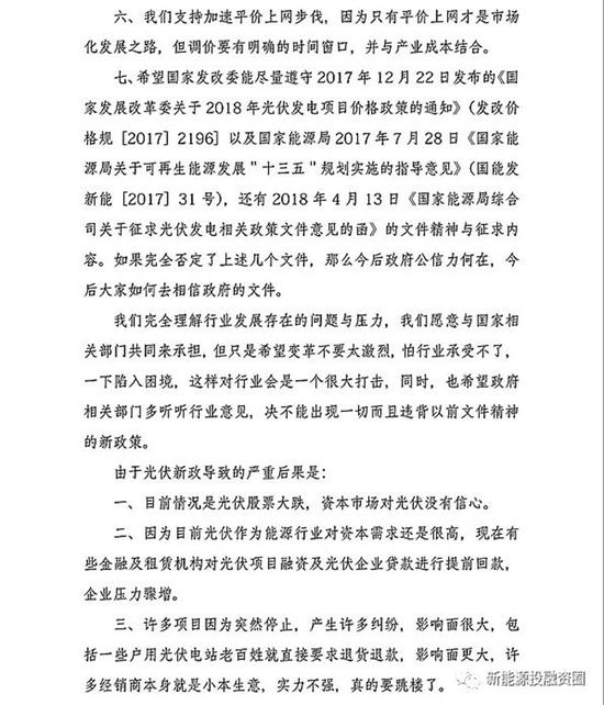 三、许多项目因为突然停止,产生许多纠纷,影响面很大,包括一些户用光伏电站老百姓(76.030, 0.00, 0.00%)(76.03 +2.55%,诊股)就直接要求退货退款,影响面更大,许多经销商本身就是小本生意,实力不强,真的要跳楼了。