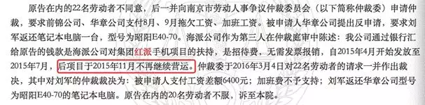 《每日经济新闻》记者在中国裁判文书网上找到了当年的民事判决书,其中一份判决书显示,南京基地的红派手机项目于2015年11月就不再运营。至于是否转移到其他基地,许多内部员工均向记者表示,未再听过红派项目。