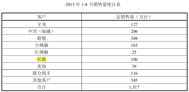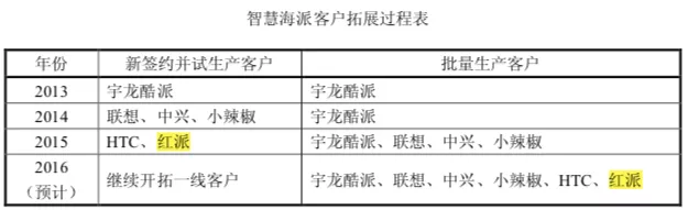 红派科技是智慧海派2015年新签约并试生产的客户,当时预计于2016年批量生产。而智慧海派披露的订单情况显示,2015年1月至8月,公司已实现对红派的总销售量为106万台,几乎比肩同期对宇龙酷派的总销售量。