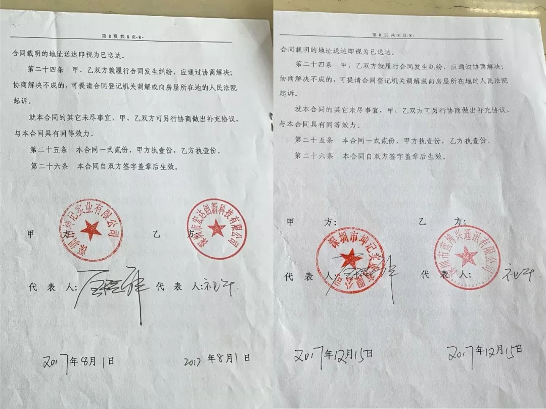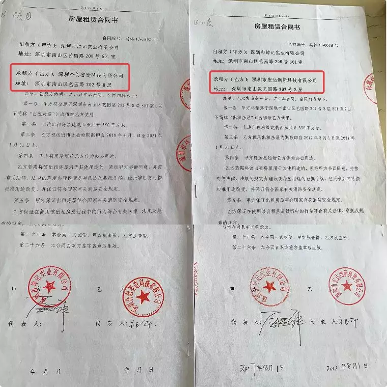不仅如此,记者还从物业管理处获取了两份租赁合同,乙方分别是深圳合创和宏达创新,承租地址都是“艺园路202号8层”。