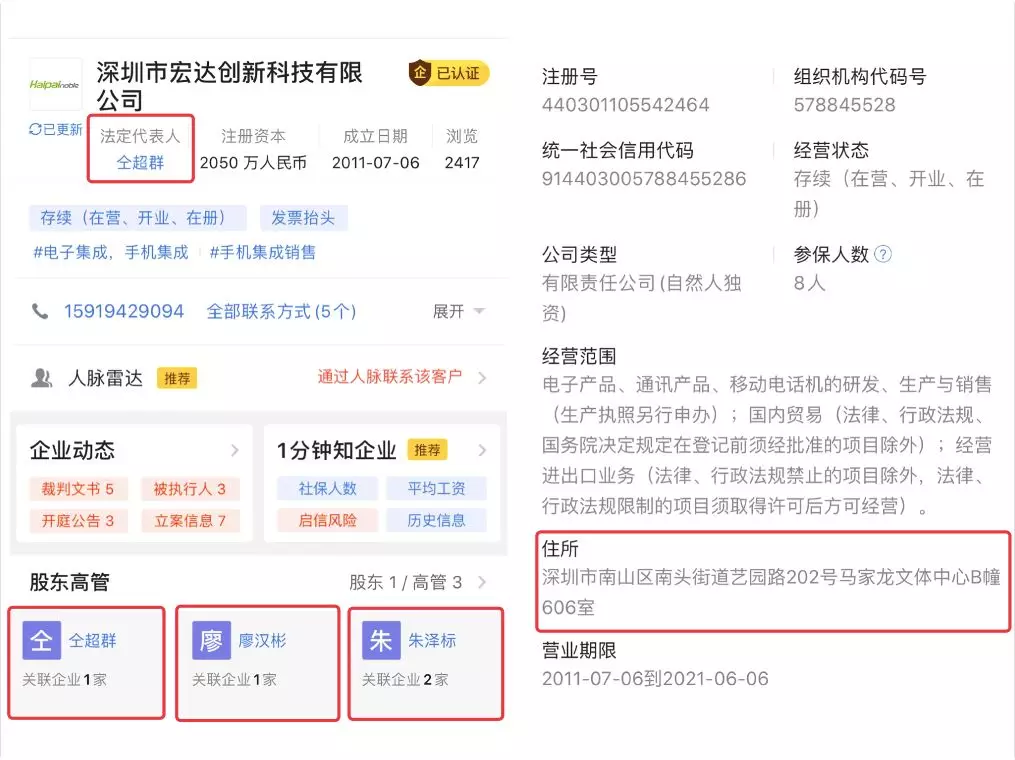 关联关系最明显的是第5家公司——深圳市宏达创新科技有限公司(以下简称宏达创新)。工商信息显示,宏达创新成立于2011年7月,其法定代表人为仝超群,总经理为廖汉彬,监事为朱泽标。注册地址为:深圳市南山区南头街道艺园路202号马家龙文体中心B幢6楼606室,此前曾入驻8楼801室。