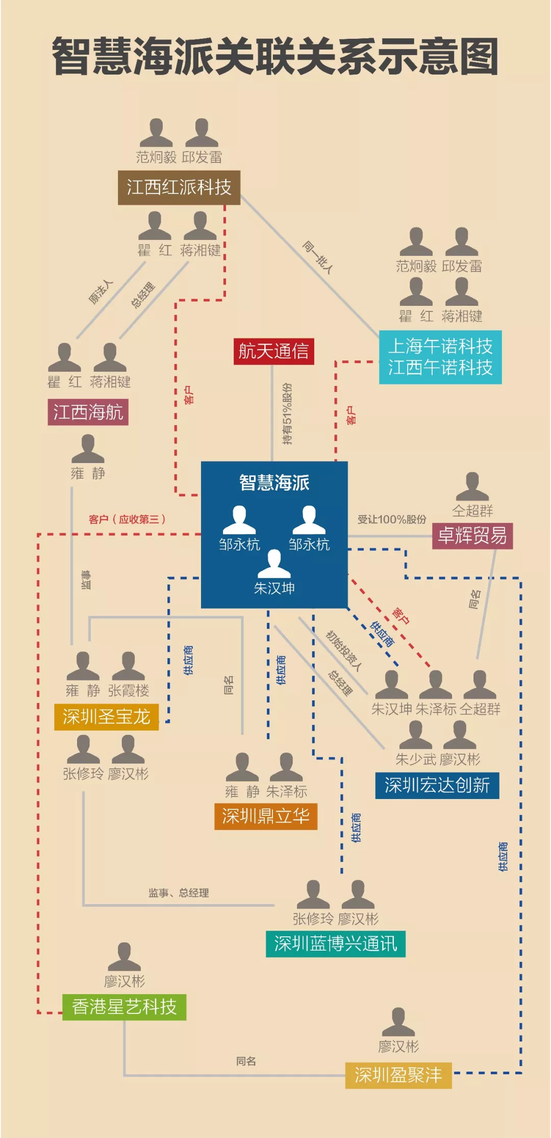 工商资料显示,江西海航的总经理名为蒋湘键,而红派科技的股东名单中也出现了蒋湘键;江西海航的法定代表人为瞿红,红派科技的初始投资人及原法定代表人也叫瞿红。另外,江西海航的股东及监事叫雍静,是一个关键人物,此人就是上文提及与智慧海派有关联关系的深圳圣宝龙的原总经理及执行董事,人称“静姐”。