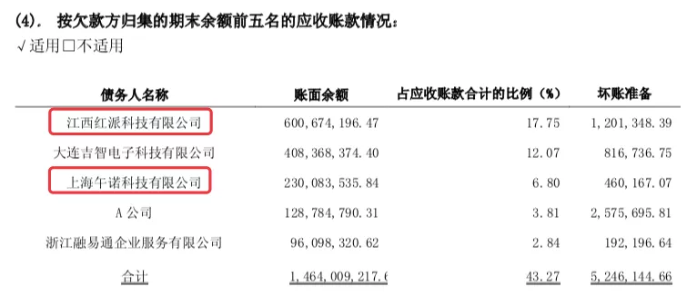 而期末应收账款余额排名第三的,便是上海午诺科技有限公司(以下简称上海午诺),期末应收账款余额为2.3亿元,计提坏账准备46万元。
