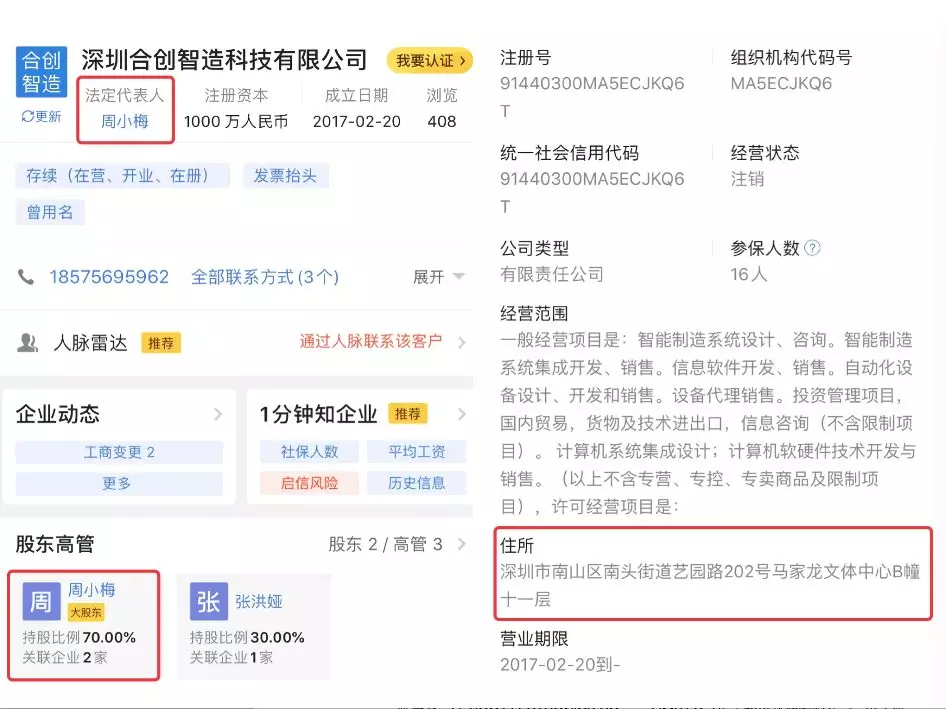 记者进一步查询发现,在注册香港合创之前,周小梅在深圳注册了一家名称相似的公司“深圳合创智造科技有限公司(以下简称深圳合创)”,目前也是注销状态。值得注意的是,其注册地址也是,深圳市南山区南头街道艺园路202号马家龙文体中心B幢11层。