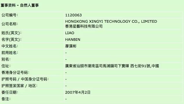 在网络上查询这家公司,并没有获取到公开资料。不过,《每日经济新闻》记者在进一步查阅董事资料时,一个熟悉的名字“廖汉彬”再次出现,这名董事与宏达创新的总经理廖汉彬同名,星艺科技的董事廖汉彬的住址为广东省汕头市潮南区。但记者未能进一步证实是否为同一人。