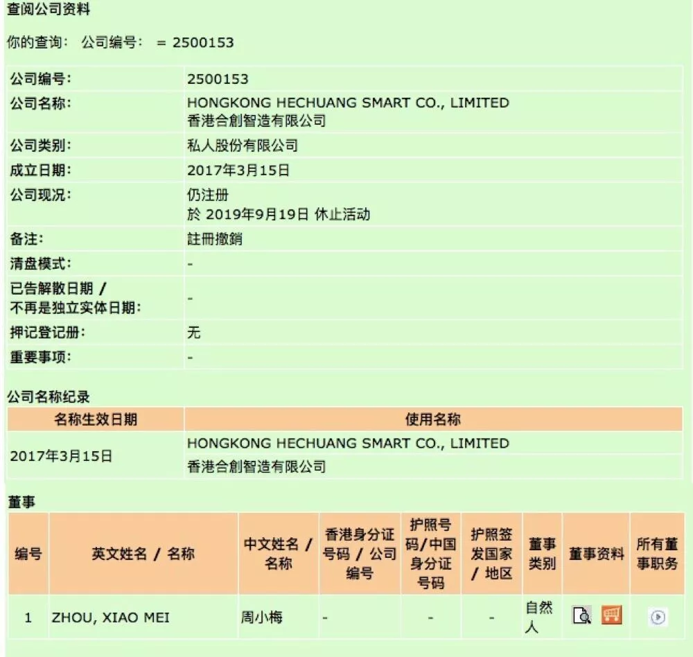 香港工商信息显示,香港合创成立于2017年3月15日,董事为周小梅。也就是说香港合创2017年刚成立,就成为了航天通信的大客户。这个“套路”似曾相识,红派科技当年也是如此,刚成立不久就成为了智慧海派的第一大客户。值得注意的是,香港合创已于2019年9月19日“休止活动”,即停业。
