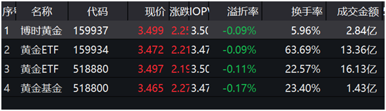 从换手率来看,易方达黄金ETF换手率达63.69%,成交金额13.36亿元,华安黄金ETF换手率22.57%,成交金额16.13亿元。