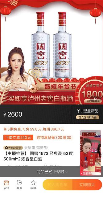 除了贵州茅台,薇娅也直播买了泸州老窖的国窖1573,原价2600元2瓶,在其直播室1800元可得三瓶。