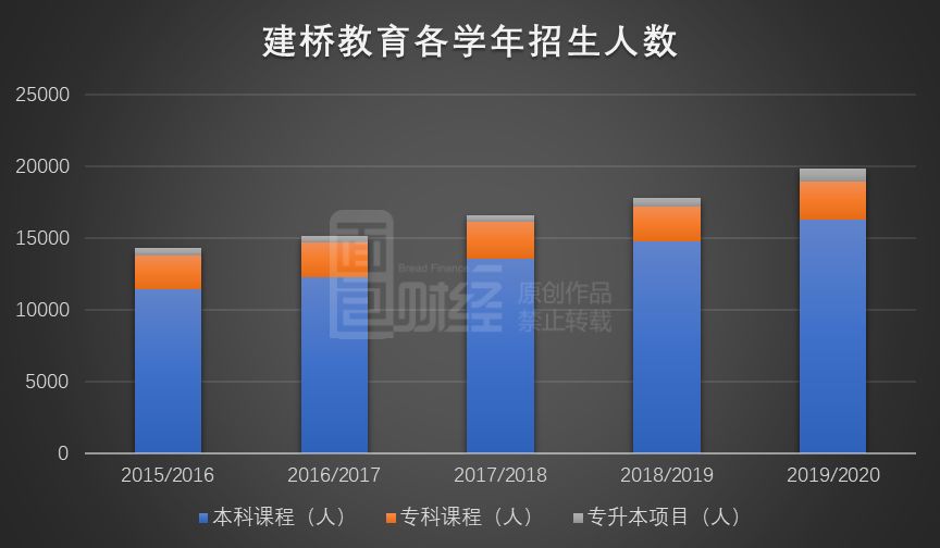 具体从招生人数来看,数量由2015/2016学年14299人上升至2019/2020学年的19857人,复合增速为8.56%。其中,本科课程是增长主力,同期的数量由11435人上升至16304人。