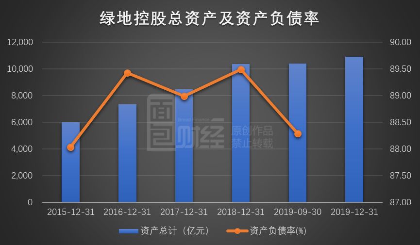 截至2019年末,绿地控股总资产达10913.85亿元,较上年末增长5.29%。然而在总资产增长的同时,绿地控股的资产负债率也保持在高位。