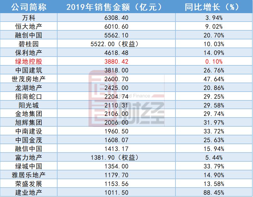 与同行业其他上市房企相比,绿地控股全年销售金额增速远不如其他房企。目前,公布2019年全年经营数据且累计销售金额超过1000亿元的房企共计20家。绿地控股销售金额仅次于保利地产排在第六,但增速较低。