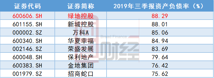 由于多数企业并未发布业绩快报,以2019年三季报数据来看,与A股其他大型上市房地产企业相比,绿地控股的资产负债率较高。